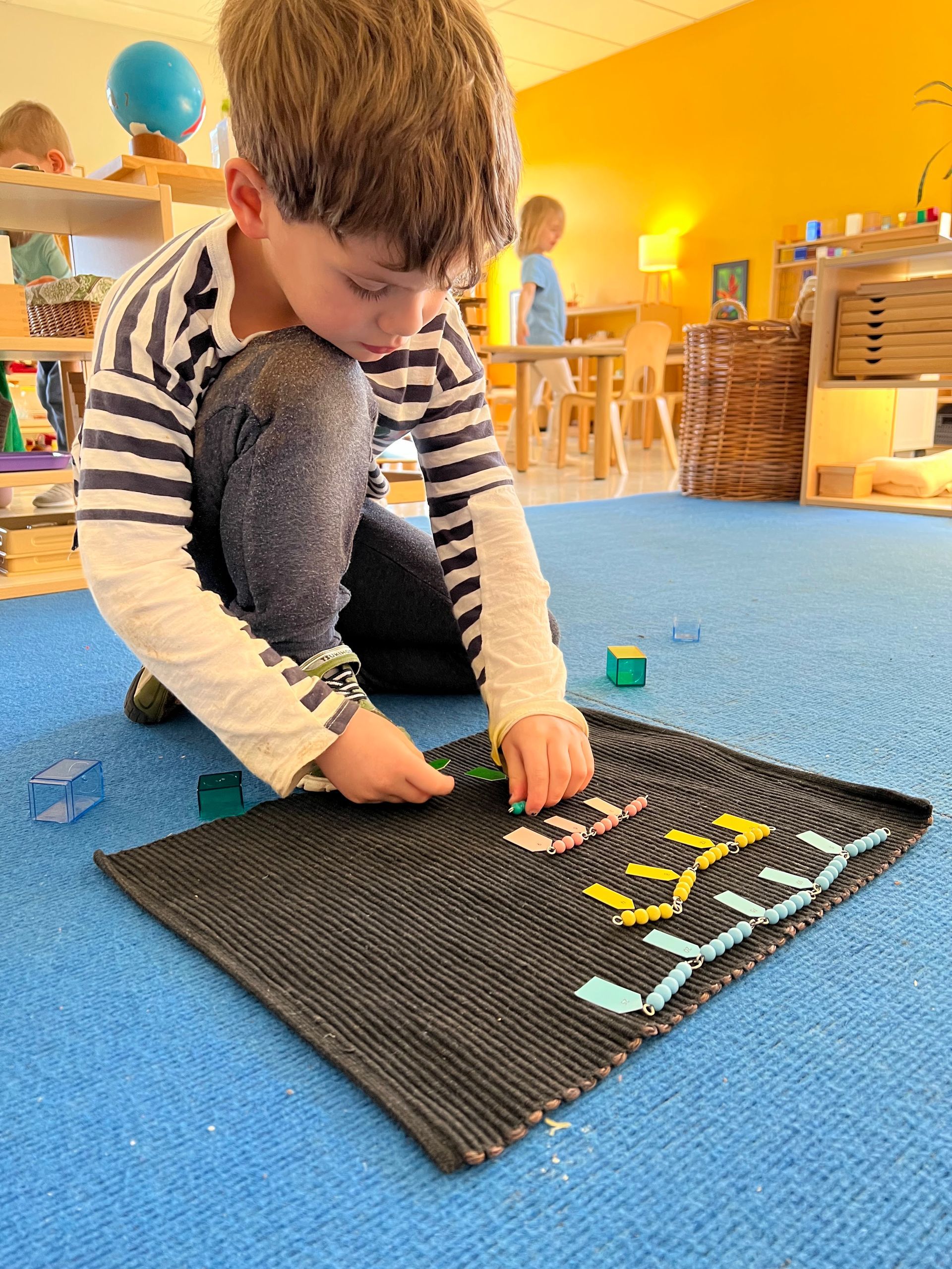 In Children’s House, young children are attracted to the beauty and fragility of these colorful, glass beads. Long before they are ready to use the bead chains, young children can learn how to dust and care for the beads. They develop a respect for the materials and understand how special they are. Often two- and three-year-olds will watch in awe as their older classmates learn how to carry, lay out, count, and label the bead chains.