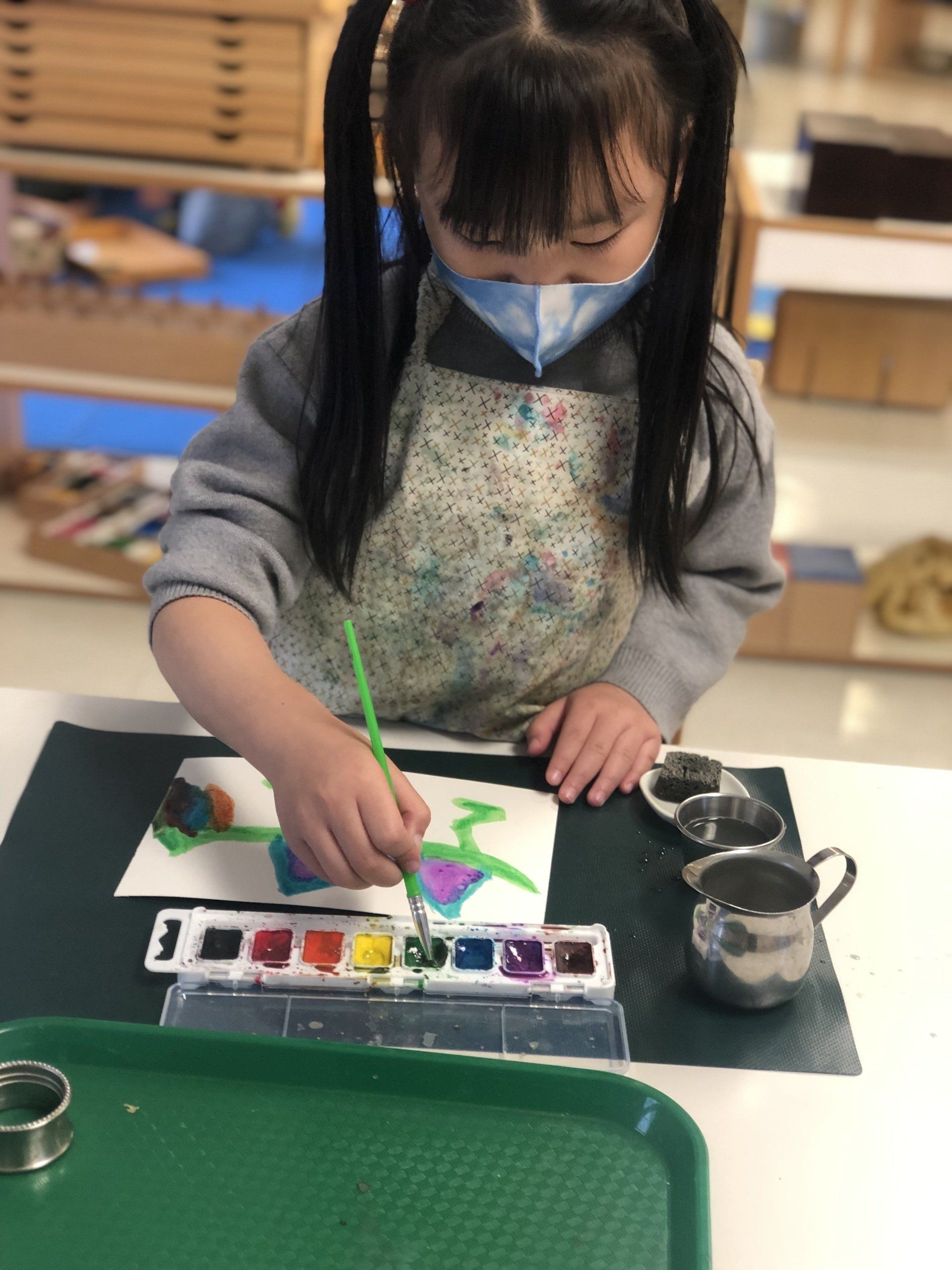 The Montessori philosophy encourages freedom, within limits, and art is no different. Once a child has received an art lesson, they are free to do the activity on their own. This ensures that the child knows how to start the task, use the materials gracefully, and clean up after themselves.