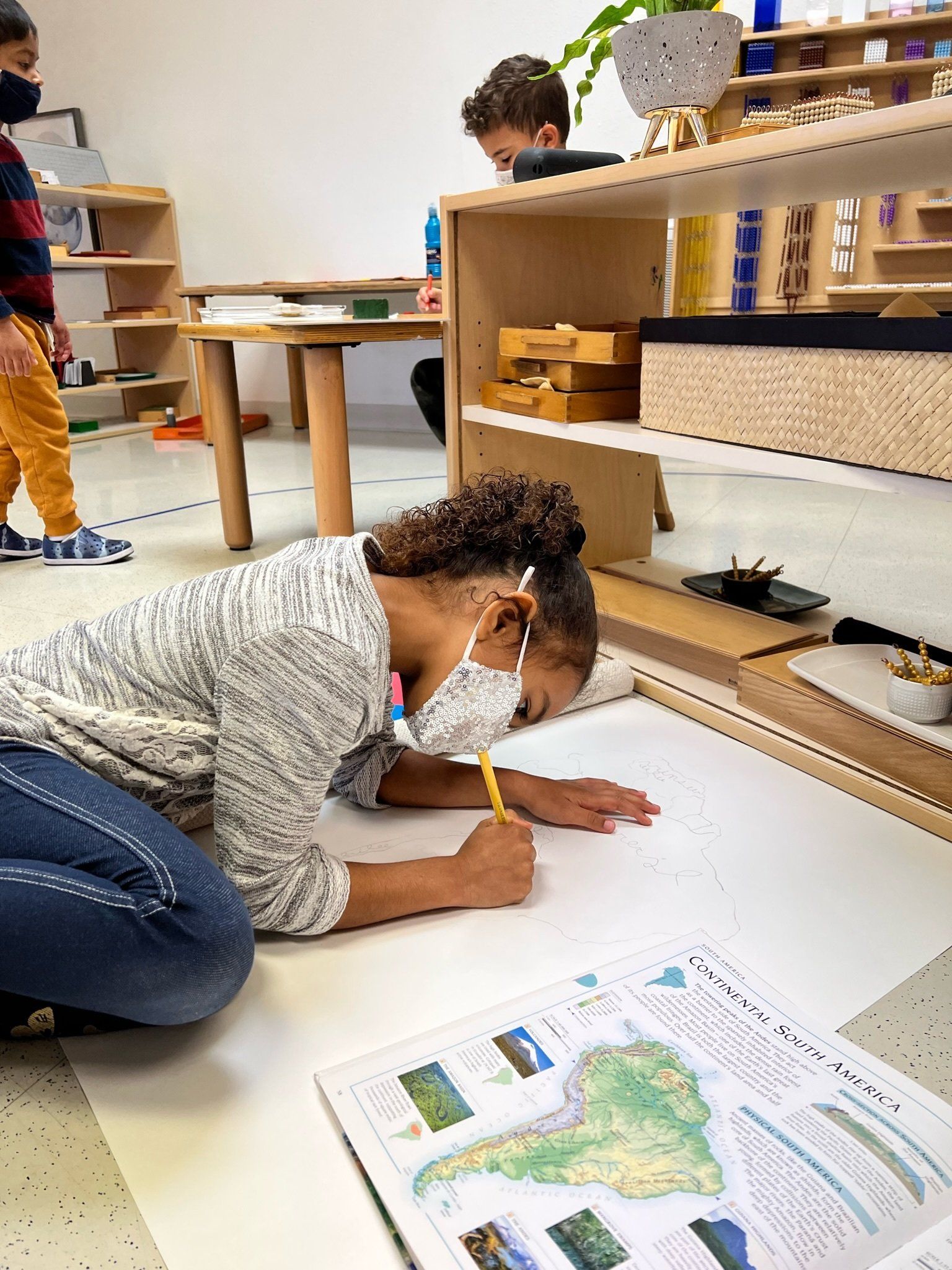 As with all things Montessori, our art curriculum builds from simple to complex. The basic skills of cutting with scissors, using a glue stick or liquid glue, and the proper use and care of a paintbrush all translate into other areas of the classroom. For example, a child might paint their world map with watercolors or trace and cut the shapes in the geometric cabinet drawers out of colored construction paper. Coloring, cutting, and gluing are part of life in an active Montessori classroom and it’s important that the children learn to do so independently and with confidence.