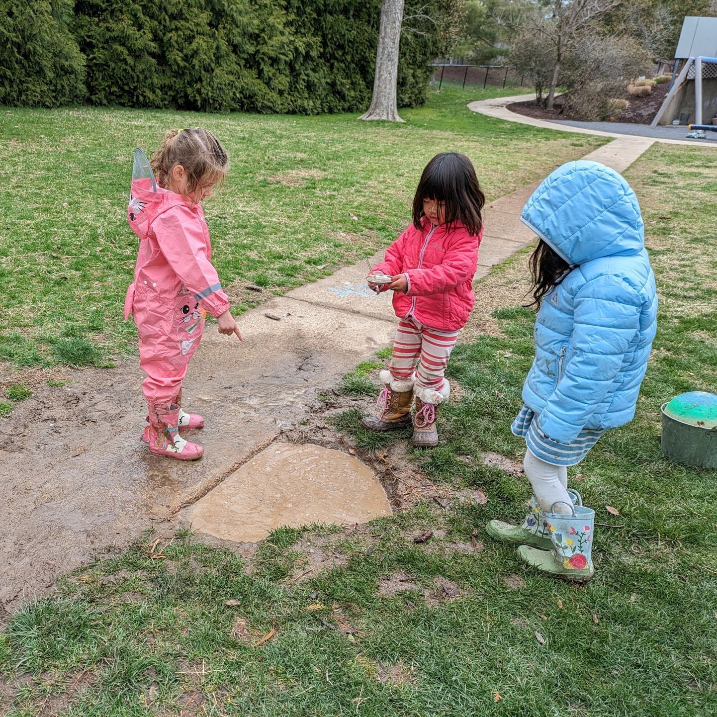 The playground, a miniature world, is teeming with activity. Children are eager to explore its wonders: some examine ants marching in a line, and others chase butterflies and insects. A few collaborate to build structures from collected branches, leaves and pine cones. Some jump in rain-formed puddles, while others dig and gather soil with small shovels and buckets, possibly finding worms.