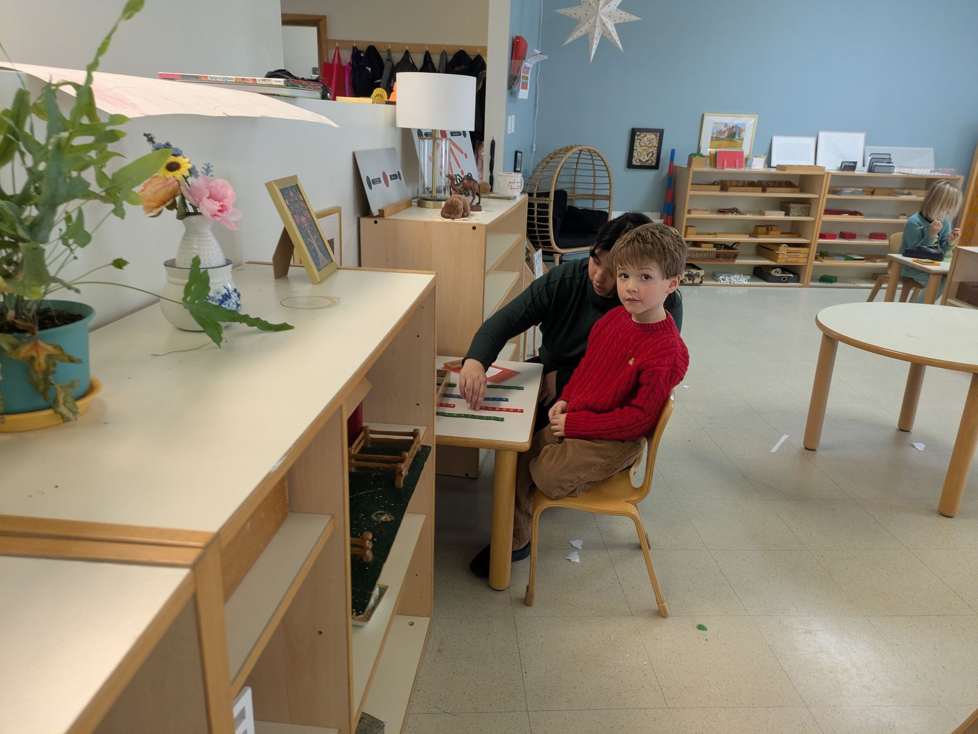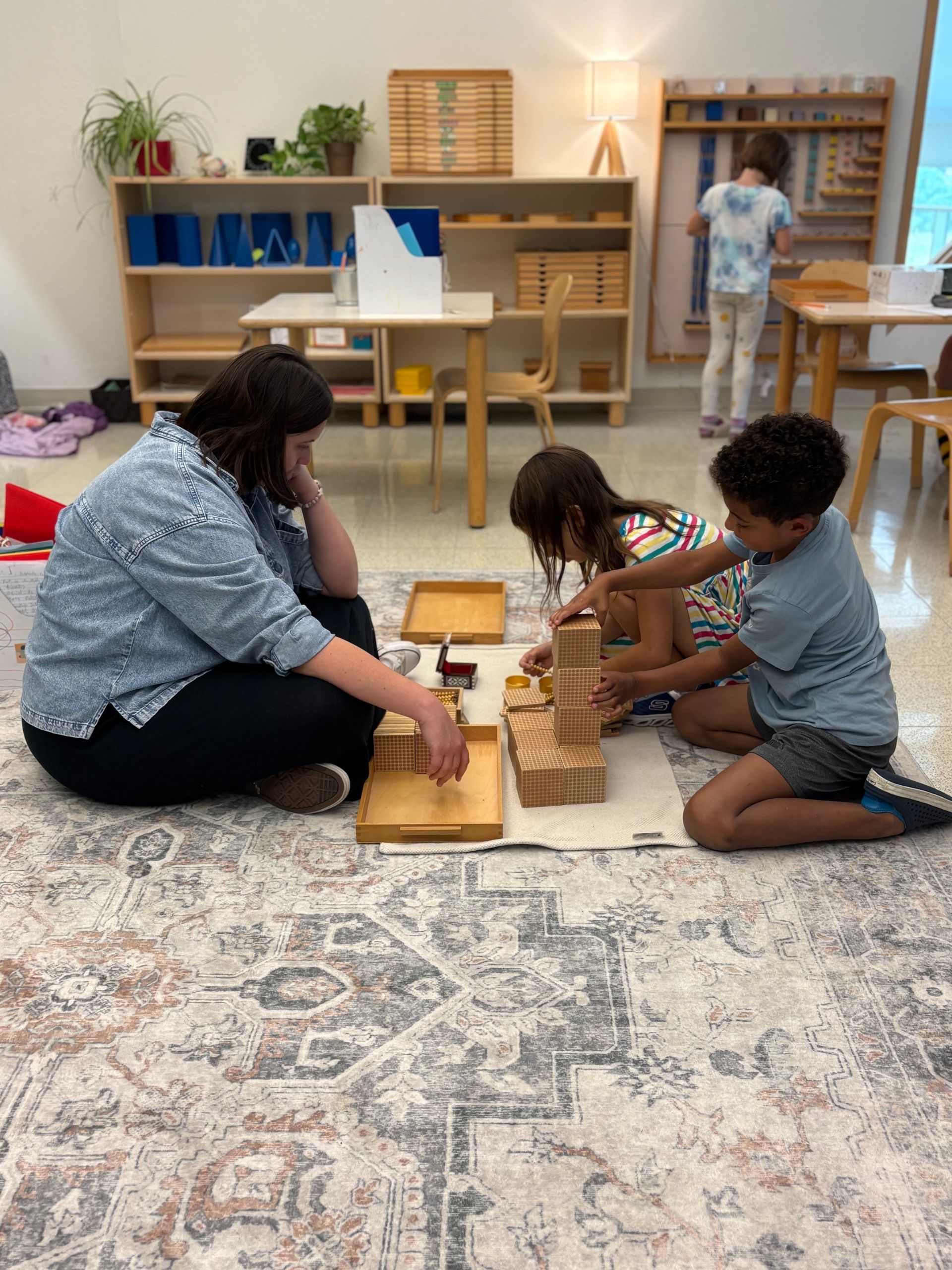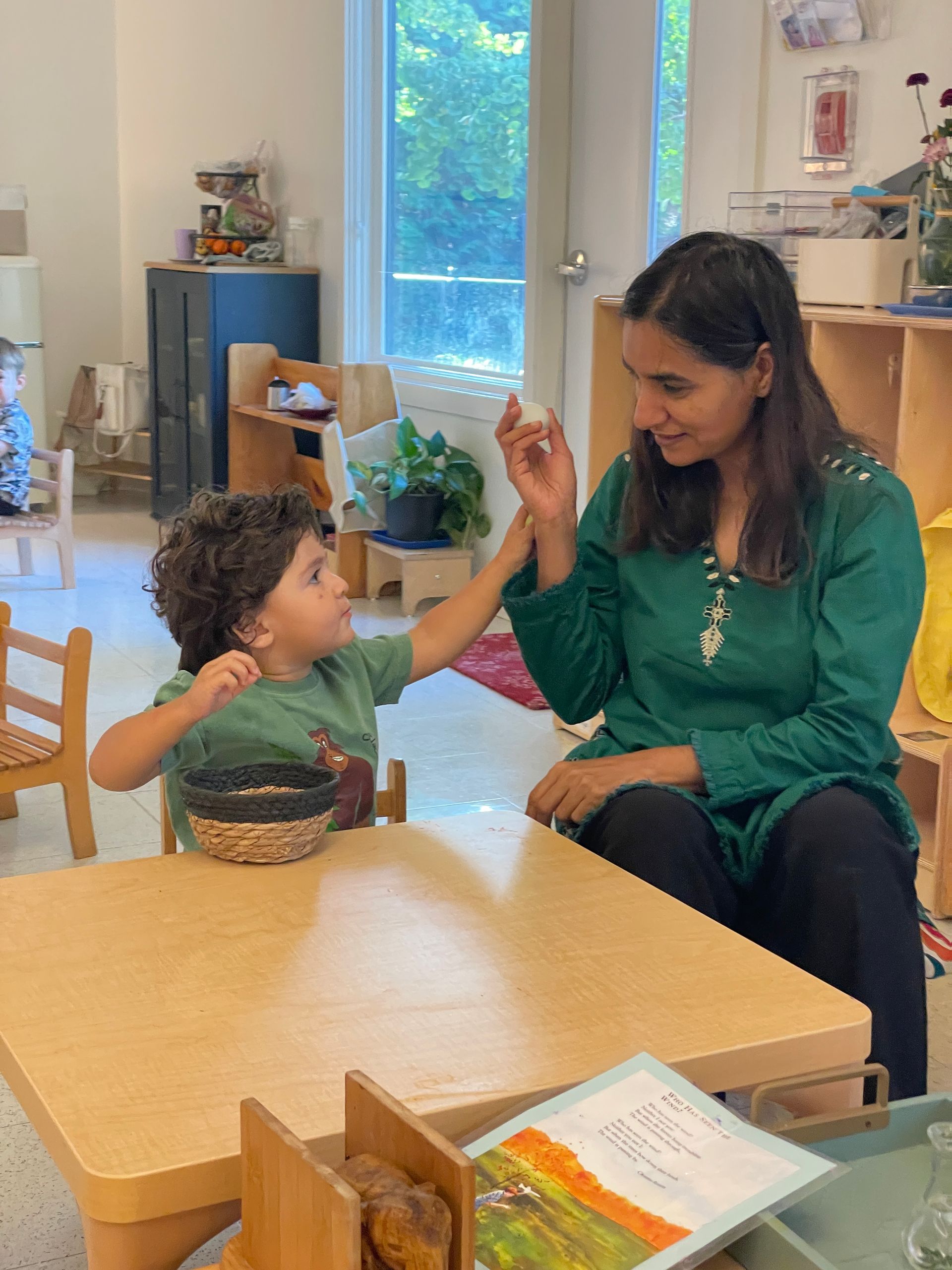 From Ms. Meg, pictured above, Assistant of our Primary Juniper room - "In my classroom I help prepare the environment for the child through a variety of different tasks. I ensure that the papers for all the different works are already on the shelves for the children. I also ensure that all the practical life works have their necessary materials. I usually have cleaned them the day previously to ensure they are ready for the child to work with immediately. If any materials need replacing through the day I do so as quickly as possible without districting the work of the children. Ms. Megan or I will observe if a work is being engaged with properly and remove after some time or alter it if not. If the children do not show a particular interest in the work, it may be removed. We also ensure to have a regular rotation of spoken language cards/ three-part cards to reengage the children's interest as they are incredibly important materials that should be worked with every day".