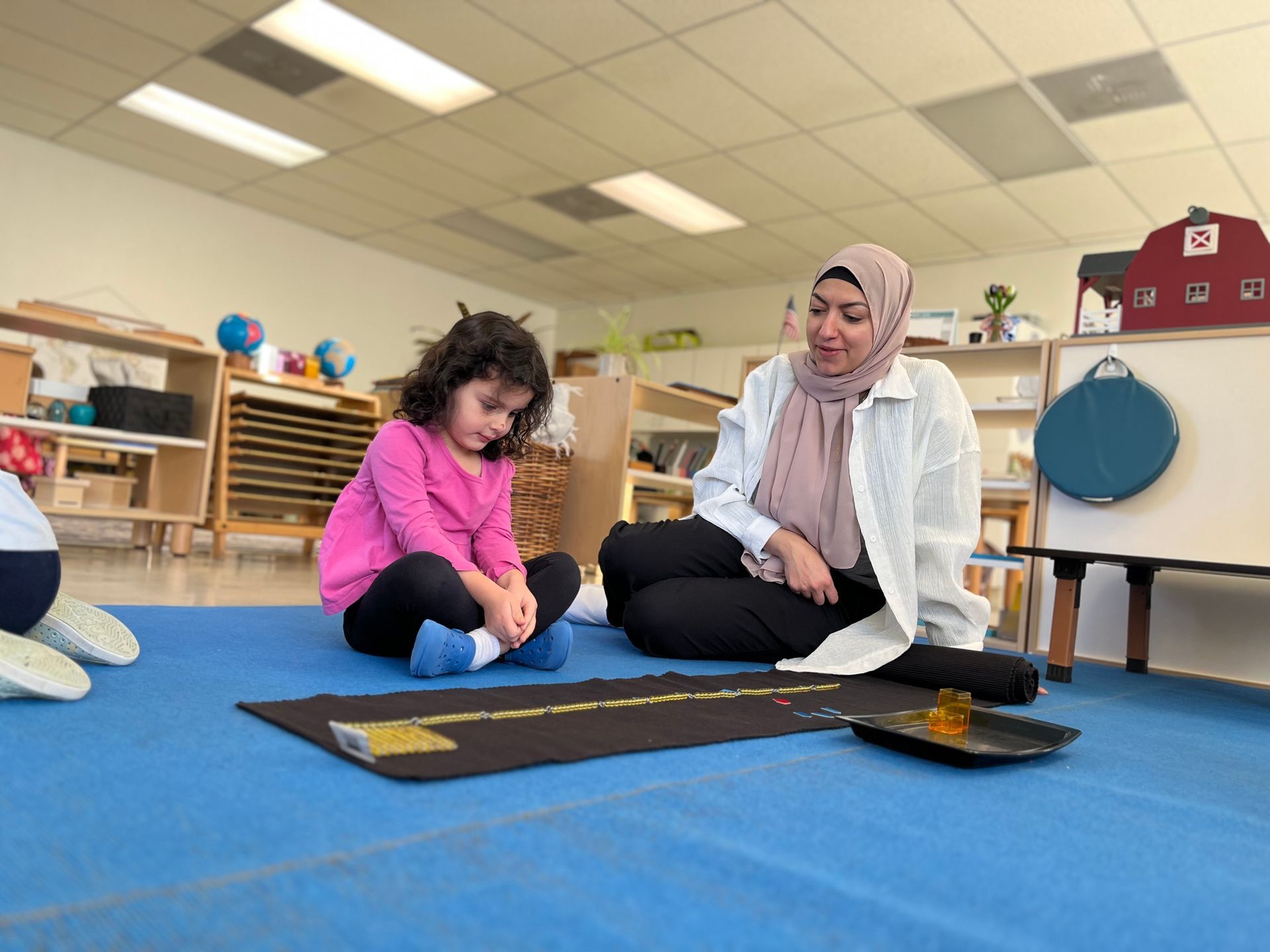 The Prepared Environment includes the physical aspects in the primary classroom that allow the children to work in ways that meet their natural tendencies. Movement through the classroom is encouraged by a limited number of obstacles. Too many shelves and tables in the classroom limits their movement and walking the line develops their Control and Coordination of Movement, which is a development of fine and gross motor skills as they learn to balance and move with precision. Provided are a specific set of materials for each individual work. No two materials share resources and any resources that need replacing are easily replaced by the child once they are finished so it is ready for the next child. When new works are presented to the child, they are presented in an exact order, and they are also shown how to clean it up. These materials have specific places on the shelf where they belong and are always returned there, so the child always knows where to find a work.